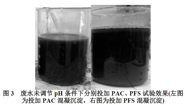 廢水不投加pH調節劑,維持原水pH為5.5時,分別單獨投加200mg/L的PAC、PFS及3mg/L的PAM進行混凝沉淀試驗,試驗采取平行對比三次均值法。試驗結果顯示,不調節pH維持原水pH為5.5條件下,分別投加PAC、PFS,兩者均無明顯表觀反應,無沉淀物產生,水樣渾濁(見圖3),經取樣分析測定,兩者對廢水中的污染物CODCr、LAS、色度均無明顯去除作用效果。